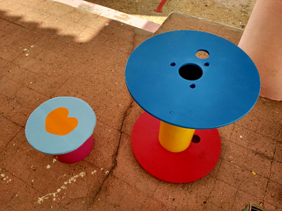 The drums are now changed into new benches and round tables that are used by the children, who have come back to school with plenty of surprises and smiles.