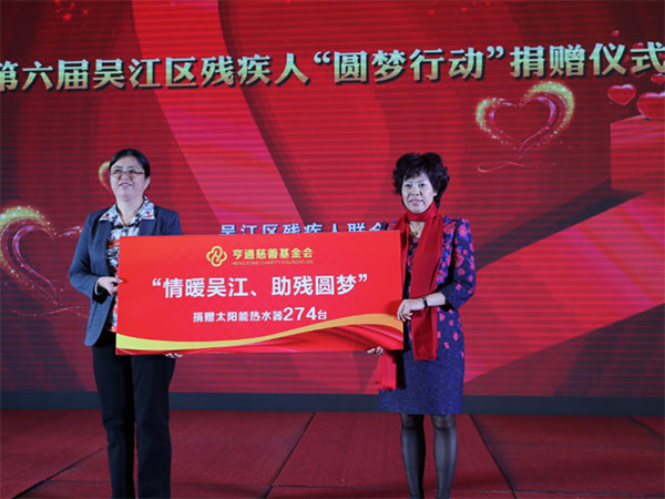 11月4日,八辆满载太阳能热水器的卡车从亨通集团总部驶出,亨通慈善基金会和吴江区残联联合举办的2016第六届残疾人“圆梦行动”由此正式拉开帷幕。当天,亨通共向全区274户残疾人贫困家庭捐赠了太阳能热水器。