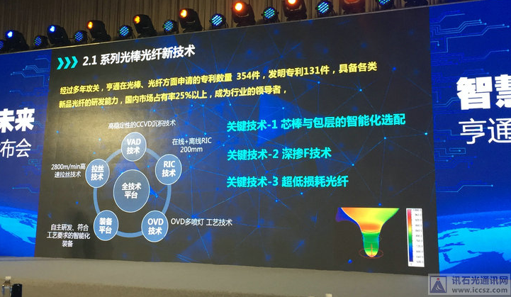 史惠萍博士介绍,亨通光电全技术平台包含高稳定的CCVD沉积技术、200mm在线+离线RIC技术、OVD多喷灯工艺技术、2800m/min高速拉丝技术和智能化装备,实现芯棒与包层智能化选配以及研发出超低损耗光纤。