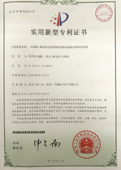 此次,取得的三项实用新型专利为:一种镍铬-镍硅热电偶用精密级耐高温热电偶补偿导线,一种飞机用高强度耐磨耐高温柔软型导线,一种飞机发动机用耐高温柔软型电线。