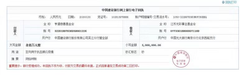 为积极响应全国工商联、江苏省工商联就新型冠状病毒感染肺炎疫情发出的通知要求,结合当前疫情防控形势,亨通集团发挥自身全球资源优势,向江苏省光彩事业基金会、湖北省红十字会等捐赠700万元(其中,300万元现金,200万元以上用于全球紧缺物资采购,200万元电力物资用于雷神山医院建设),驰援疫区防控,积极投身肺炎疫情防控阻击战。